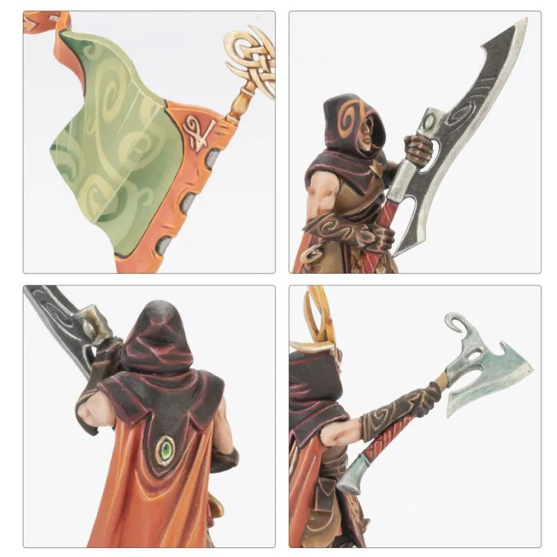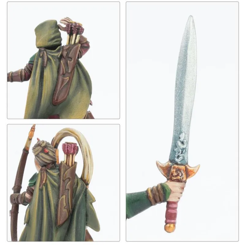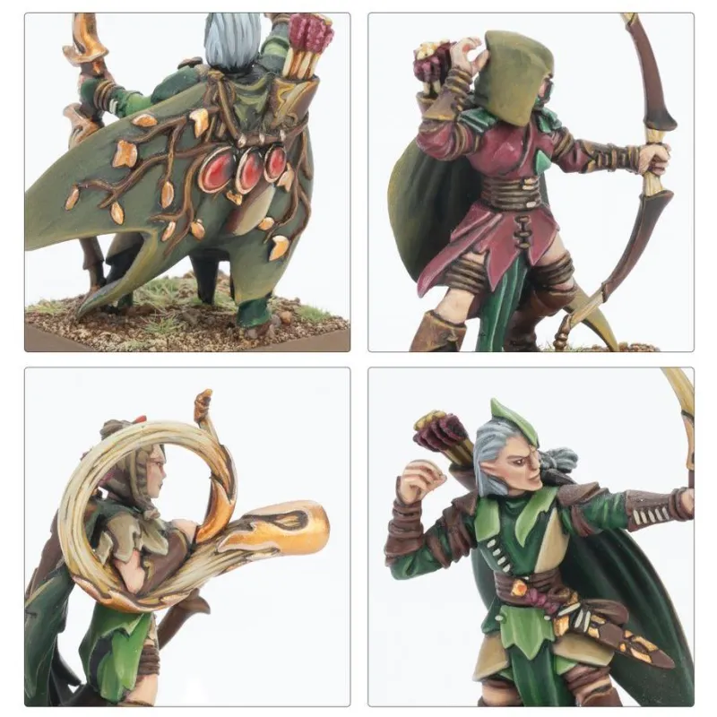 LA GUARDIA DEL CLARO PUEDE ENSAMBLARSE COMO UNA UNIDAD GRANDE O DOS UNIDADES DE 16 ARQUEROS: cada una con su propio campeón opcional, portaestandarte y músico. El campeón puede construirse sosteniendo un arco largo Asrai o una espada, hay una opción de dos remates de estandarte para el portaestandarte, y las cabezas, piernas, torsos, capas y armas son intercambiables entre las miniaturas. Estas miniaturas también pueden usarse para representar Exploradores del Bosque Profundo.