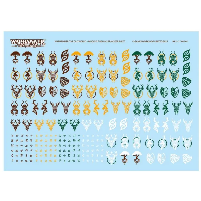 ESTE CONJUNTO TAMBIÉN INCLUYE 2 HOJAS DE TRANSFERENCIAS DE LOS REINOS DE LOS ELFOS DEL BOSQUE, CADA UNA CONTENIENDO 186 TRANSFERENCIAS DE ALTA CALIDAD PARA DECORAR TUS MINIATURAS: