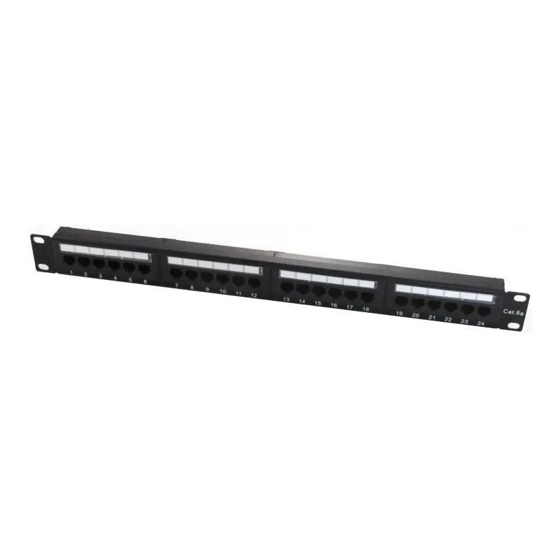 Panel de parcheo Wp WPC-PAN-6AU-24 con 24 puertos RJ-45, blindaje U/UTP, montaje en bastidor 1U y gestión de cables, color negro
