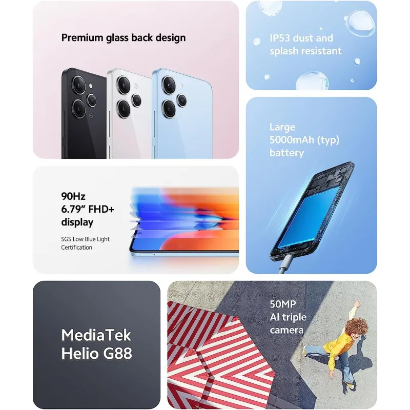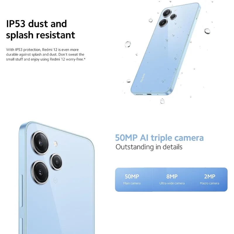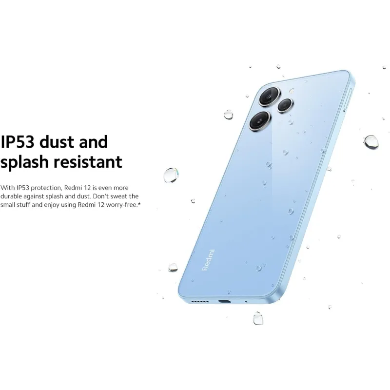 RESISTENCIA IP53 AL POLVO Y A LAS SALPICADURAS: Con la protección IP53, el Redmi 12 es aún más resistente a salpicaduras y polvo. Relájate y disfruta del Redmi 12 sin preocupaciones.