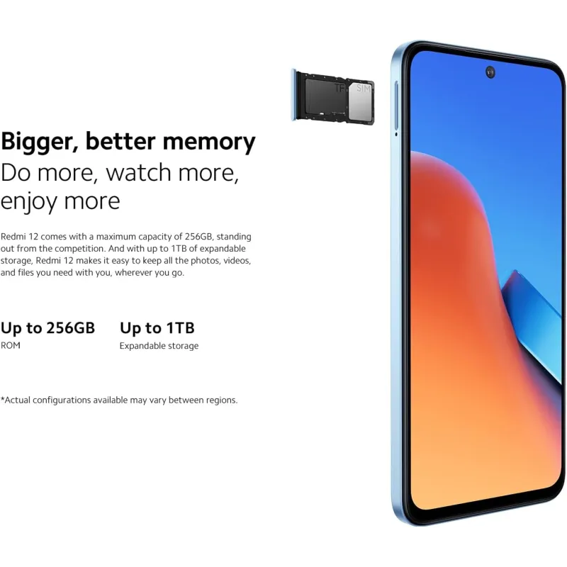 MEMORIA MÁS GRANDE Y MEJOR HAZ MÁS, VE MÁS, DISFRUTA MÁS: El Redmi 12 tiene una capacidad máxima de 256 GB, que lo convierte en un referente en su segmento y es ampliable hasta con 1 TB de almacenamiento ampliable, el Redmi 12 te permite guardar fácilmente todas las fotos, vídeos y archivos que necesites, vayas donde vayas.