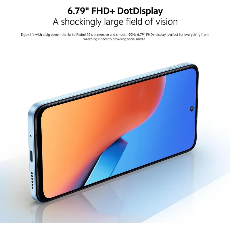PANTALLA DOTDISPLAY FHD+ DE 6,79" UN CAMPO DE VISIÓN SORPRENDENTEMENTE AMPLIO: Disfruta reviviendo tus momentos con la pantalla FHD+ de 6,79" y 90 Hz del Redmi 12. Envolvente, fluida y de gran tamaño, es perfecta para todo, desde ver vídeos hasta navegar por las redes sociales.