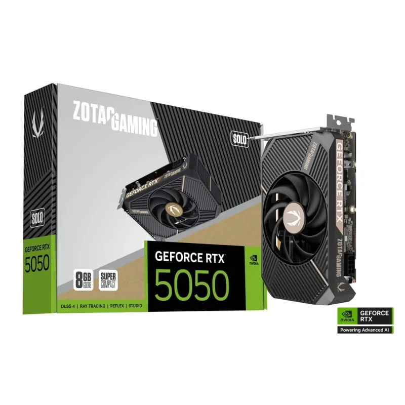 LA ZOTAC GAMING GEFORCE RTX 5050 SOLO ES UNA TARJETA GRÁFICA SUPER COMPACTA: La ZOTAC GAMING GeForce RTX 5050 SOLO es una tarjeta gráfica super compacta impulsada por la arquitectura Blackwell de NVIDIA, DLSS4 y 8GB de memoria GDDR6. Con un solo ventilador y un diseño de doble ranura, la SOLO está lista para ofrecer un gran rendimiento en un espacio minúsculo.