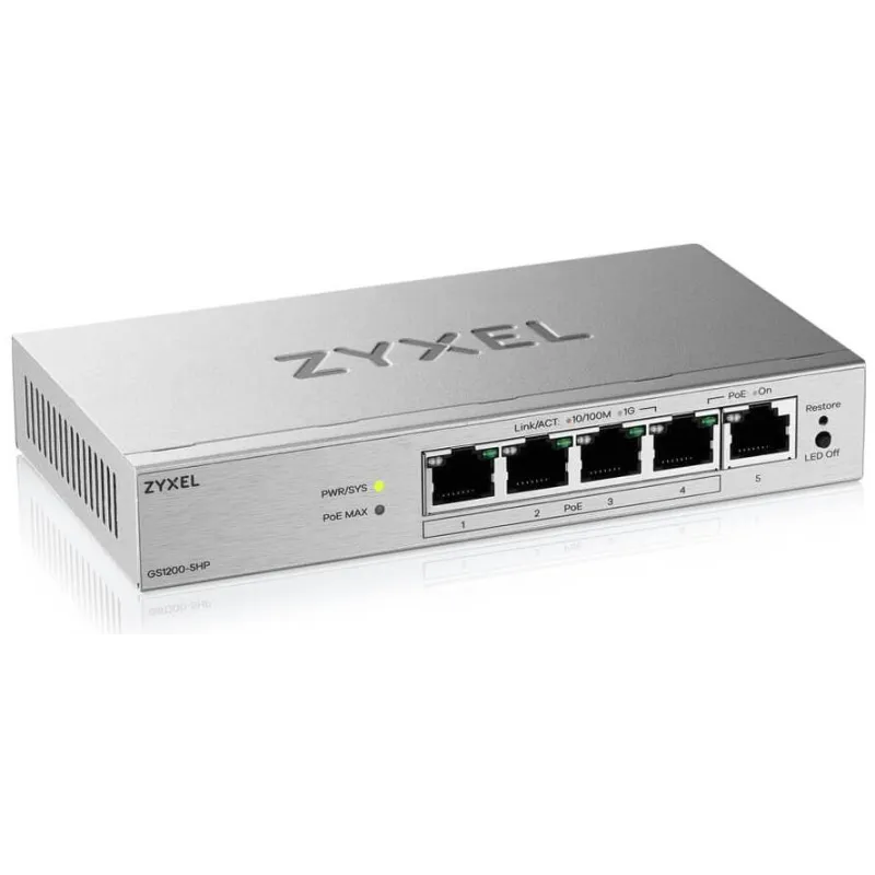 Zyxel GS1200-5HPv3 es un switch PoE gestionado L2 con administración basada en web, orientado a redes pequeñas que necesitan datos y alimentación por Ethernet en el mismo equipo.