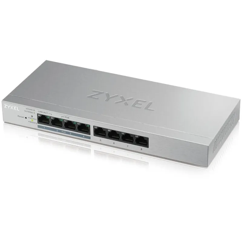 Switch Zyxel GS1200-8HP v2 Switch gestionado con 8 puertos Gigabit 4 PoE+ QoS VLAN y 16 Gbps de capacidad, para redes eficientes, plata