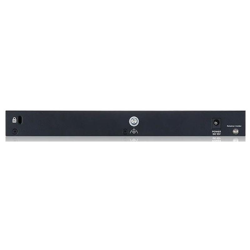 El diseño compacto permite el montaje en rack, y su consumo de energía es eficiente, con un máximo de 13,13 W. El conmutador es adecuado para entornos que operan en un rango de temperatura de 0 - 40 °C y es resistente a una humedad relativa de entre 5 - 95%.